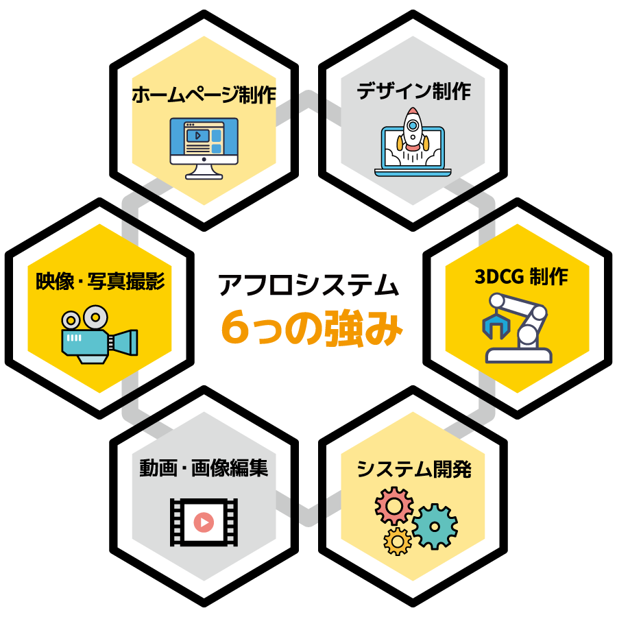 アフロシステム株式会社は、ホームページやチラシのデザイン、システム開発、印刷、動画、ロゴ制作、写真・映像の撮影など、幅広い分野に対応しています。