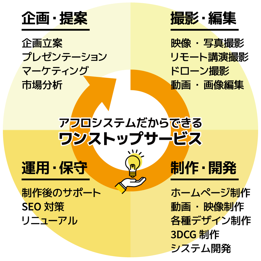 アフロシステム株式会社は、ホームページやチラシのデザイン、システム開発、印刷、動画、ロゴ制作、写真・映像の撮影など、幅広い分野に対応しています。