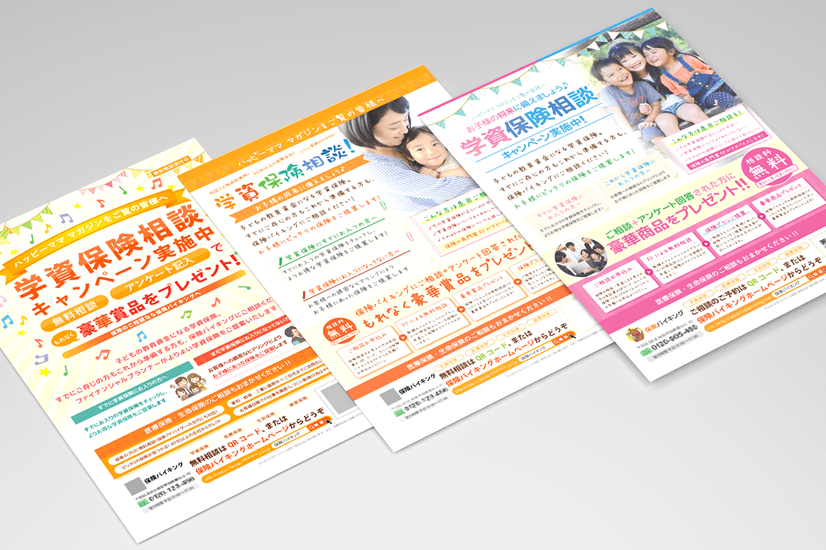 保険バイキング様のホームページは暖色系の温かみのあるイメージでデザインしましたが、今回はハピママ(ハッピーマママガジン)に合った配色とレイアウトを目指しました。そして、ハピママ読者が学資保険相談へつながるメッセージが伝わるようデザインしました。